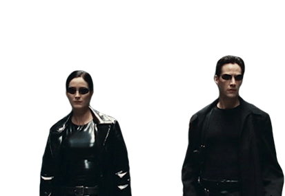 Neo and Trinity from The Matrix, portrayed by Keanu Reeves and Carrie Anne Moss, exchange a subtle side-eye glance.