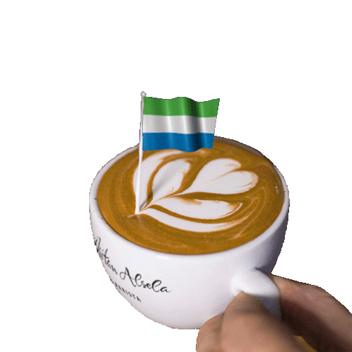 A charming coffee cup featuring beautiful latte art, adorned with a small flag of Sierra Leone, celebrating the nation.