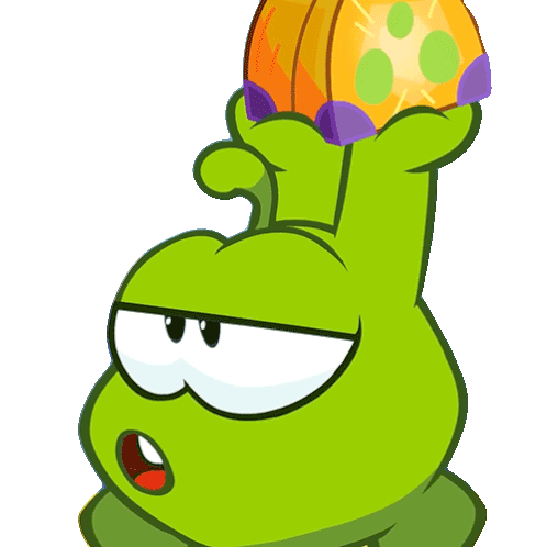 Om Nom, the green cartoon character, sighs in relief while holding an orange ball on its head.