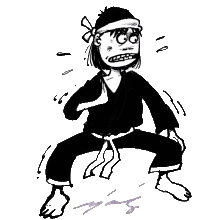 A black and white cartoon character in a martial arts uniform performs Pencak Silat stances with an intense expression.