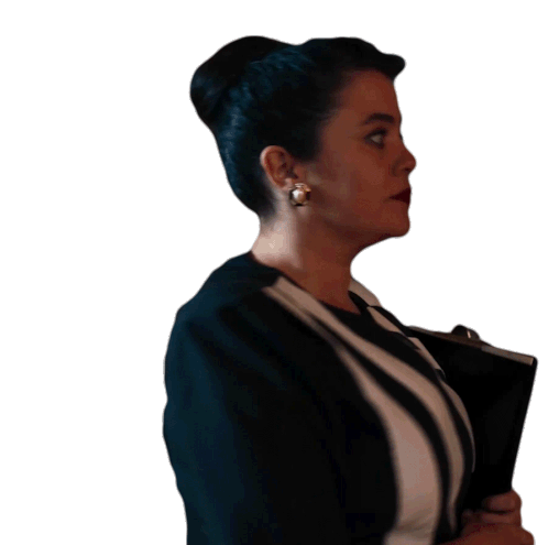 Luisa, portrayed by Edwarda Gurrola, makes a shushing gesture, asking for silence with a finger to her lips.