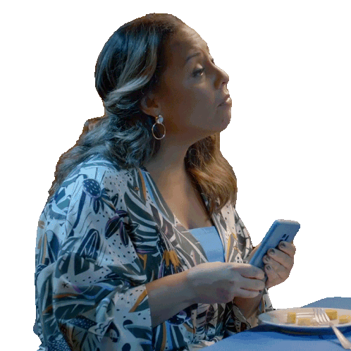 Evelyn Castro looks up with a 'Sim E Então' expression, then glances at her phone, conveying a dismissive or questioning mood.