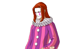 Simon Keyes, a clown-like character with red hair, is shown with a fluffy white cat appearing on his arm.
