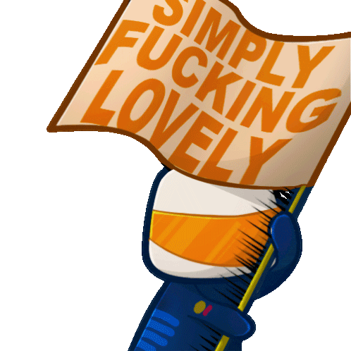 A cartoon character representing Max Verstappen waves a flag with the iconic phrase 'Simply Fucking Lovely' in this F1 sticker.