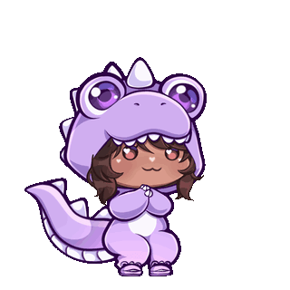 Simplymysti's cute chibi character, a happy dino girl in a purple costume, is joyfully clapping her hands.