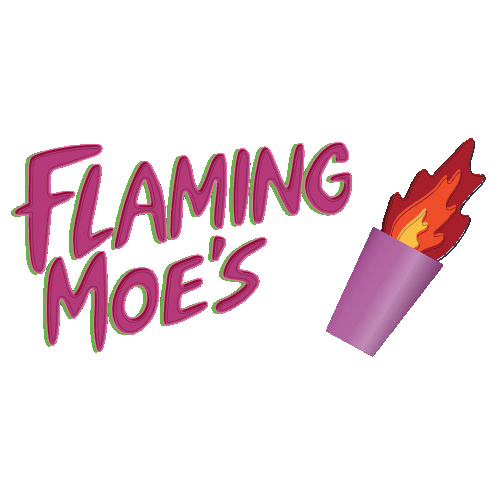 The iconic 'Flaming Moe's' logo from The Simpsons, featuring the drink's name and a flaming purple cup.
