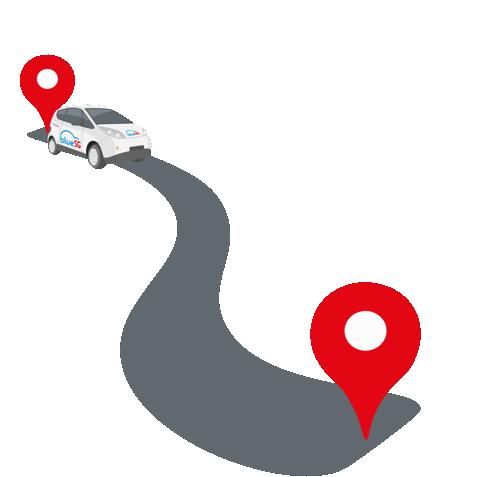 An animated BlueSG electric car drives along a winding road, with the text changing from #LETS to #LETS BLUE THERE.