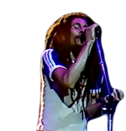 Bob Marley passionately singing into a microphone during a live concert performance, showcasing his iconic dreadlocks.