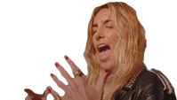 Merry Jane passionately sings or yells, expressing strong emotions with dramatic hand gestures and facial expressions.
