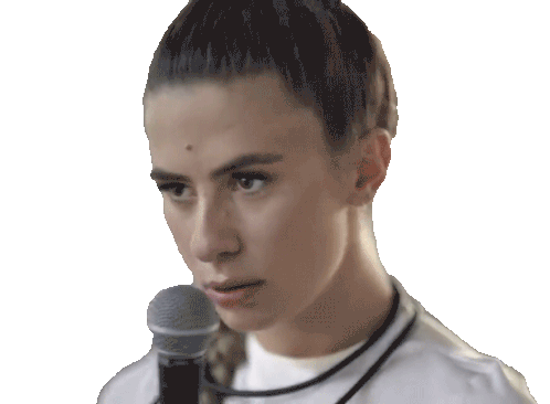 Kassi Ashton performs with a microphone, looking serious and intense, captured in a close-up shot with a focused expression.