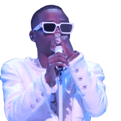 Roddy Ricch performs live, holding a microphone and wearing stylish white sunglasses and a suit.