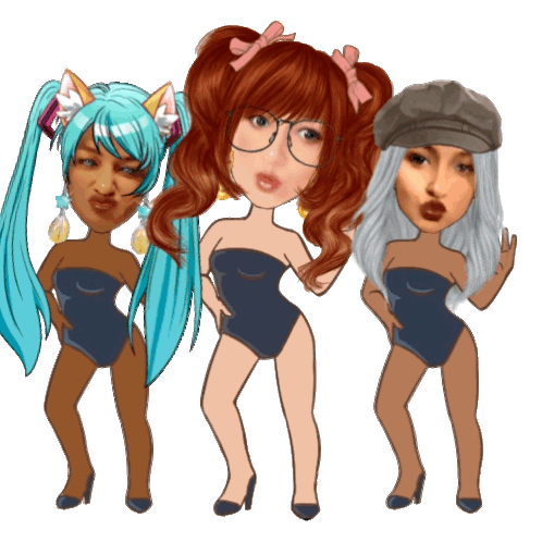 Three animated girls in swimsuits strike sassy poses, featuring diverse hair colors and playful expressions.