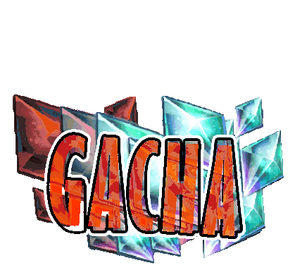 An animated sticker featuring the word GACHA in orange text over a pile of sparkling blue and purple crystals, related to Sinoalice.