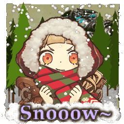 Sinoalice Red Riding Hood bundled up in a cozy winter outfit, surrounded by falling snow, with 'Snooow~' text.