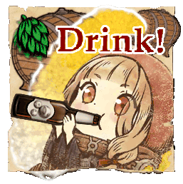 Sinoalice's Red Riding Hood character enjoying a beer, with 'Drink!' text, perfect for celebrating with Emil Brew.