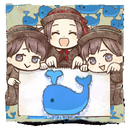 Sinoalice Three Little Pigs characters happily present a cute blue whale drawing. A charming and cheerful animated sticker.