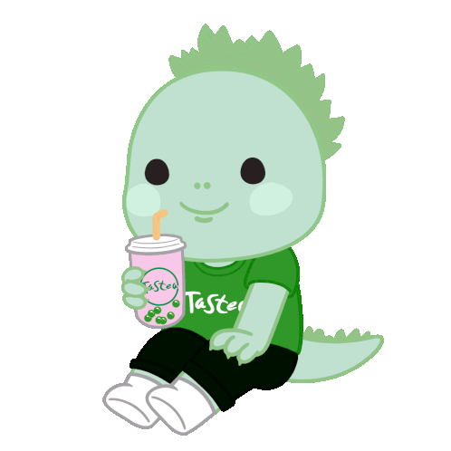 A cute green dinosaur character sips a pink Tastea bubble tea with green boba pearls, looking happy and refreshed.