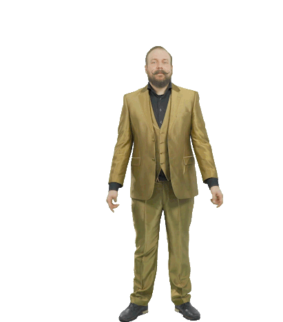 Sir Culair, a man in a gold suit, points up and down, then shrugs, representing Rotterdam Circulair.