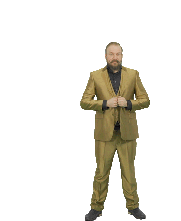 Sir Culair, a man in a shiny gold suit, enthusiastically points both hands upwards, celebrating with a vibrant gesture.