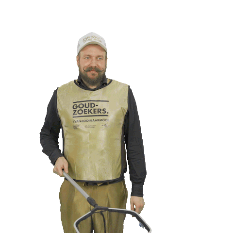 Sir Culair, the 'Goud-zoekers' gold-seeker, proudly shows off his good catch of trash with a net, promoting circularity.