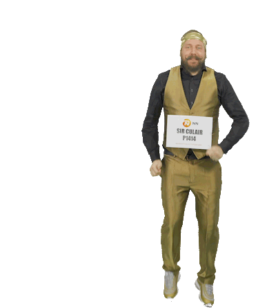 Sir Culair, dressed in a gold suit, enthusiastically runs while holding a sign for Rotterdam Circulair.