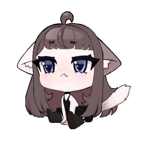 Adorable chibi cat girl Mittens sits with a slight pout, her tail gently wagging. A cute animated sticker.