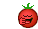 A pixelated red tomato character with a green stem laughs heartily, then falls over in amusement, showing a thumbs-up.