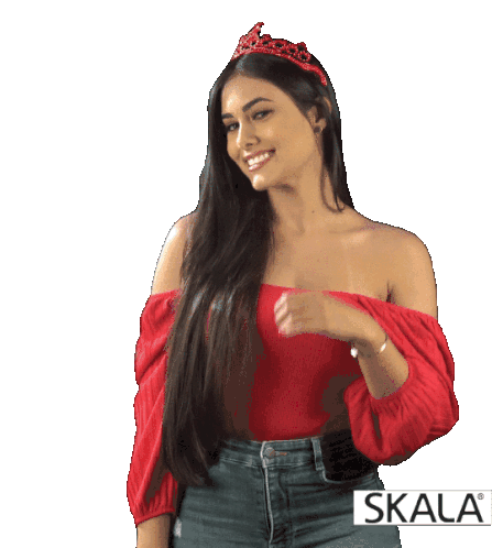 Bia Siqueira, the Skala Princess, smiles happily while wearing a crown, promoting Skala Cosmeticos products.