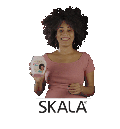 Rose Hapuque smiles, holding up a Skala Divine Pot product, promoting the #DIVINOPOTÃO campaign for curly hair.