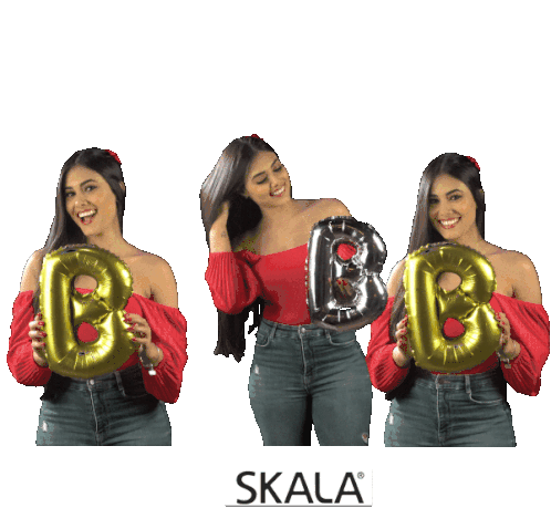 Bia Siqueira with Skala Cosmetics, celebrating 'Boa Bonita Barata' (Good, Beautiful, Cheap) with balloons.