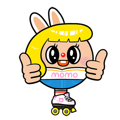 Momo, the cute cartoon character with bunny ears and blonde hair, gives two enthusiastic thumbs up while wearing roller skates.