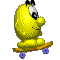 Blupi, the yellow blob-like character, rides a skateboard with blue wheels, depicted in pixel art style.