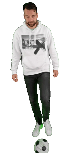 Nils Beckus, wearing a white hoodie and jeans, holds a soccer ball and gives a cheerful thumbs up.