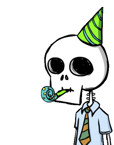 A cheerful cartoon skeleton, wearing a party hat and tie, blows a party horn with confetti. Perfect for celebrations and fun.