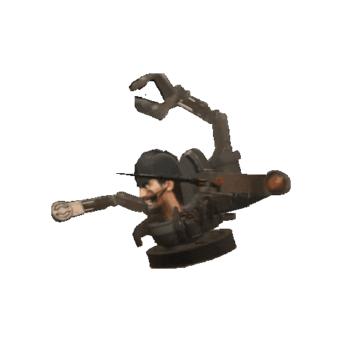 A Skibidi Toilet character, a man's head in a hat, emerges from a rotating weaponized turret with robotic arms.