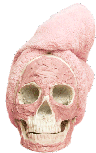 A skull enjoys a relaxing spa day, complete with a pink towel, a soothing face mask, and refreshing cucumber slices over its eye sockets.