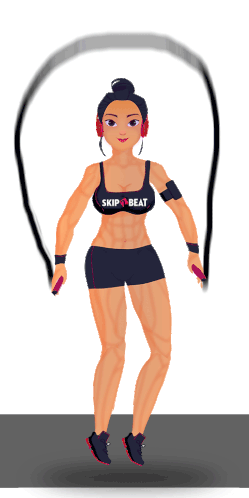 A strong, athletic cartoon woman with a bun and headphones is energetically skipping rope, wearing a sports bra with 'SKIP BEAT' text.