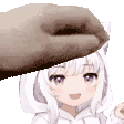 A hand gently pets the head of Skittle Chan, a white-haired anime girl in a pink outfit, showing affection.