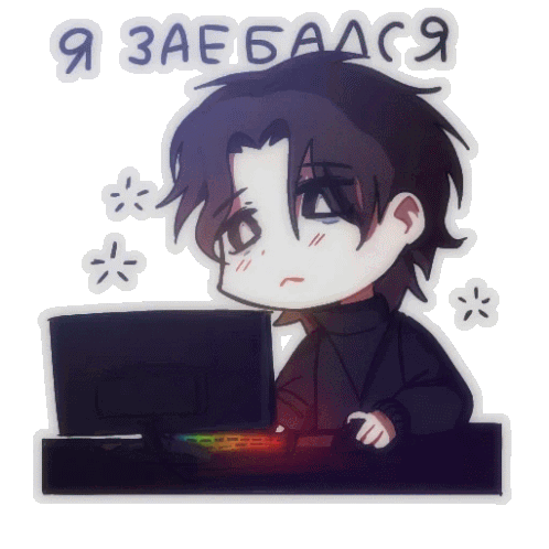 a sticker of a person sitting in front of a computer with the words " я заебался " on the bottom