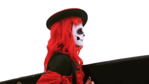 Person with vibrant red hair and Dia de los Muertos skull makeup makes a 'hang loose' sign.