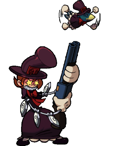 Skullgirls character Peacock, looking dizzy with star eyes, holds a shotgun while her companion Avery floats stunned.