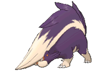 Animated pixel art sticker of Skuntank, the purple and white skunk Pokemon, in an aggressive stance.