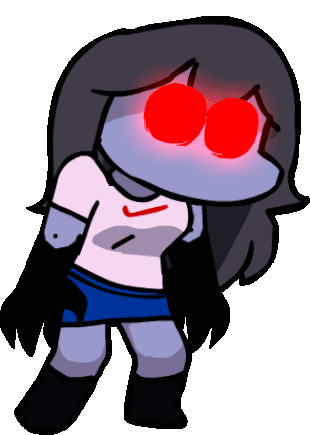 Sky, the popular FNF character, stands with glowing red eyes, wearing her signature white shirt and blue skirt.