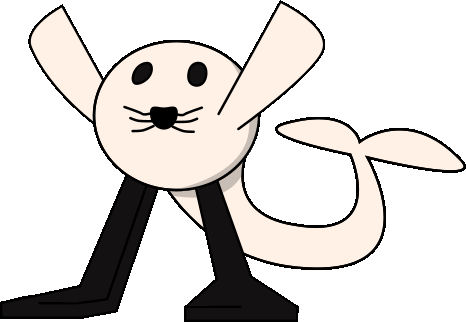 Slang Kinitopet, a unique cartoon seal with long legs and a tail, stands and looks around curiously.