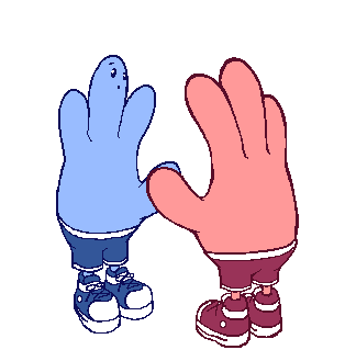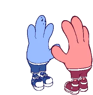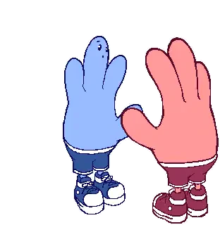 Two cartoon hands, one blue and one pink, perform a joyful high five, surrounded by floating red hearts.