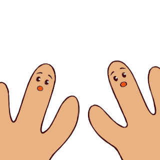 Two cartoon fingers with faces show a progression from surprised to confused and questioning expressions.