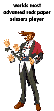 Slayer from Guilty Gear showcases his advanced Rock Paper Scissors skills with multiple hands, a pixel art sticker.