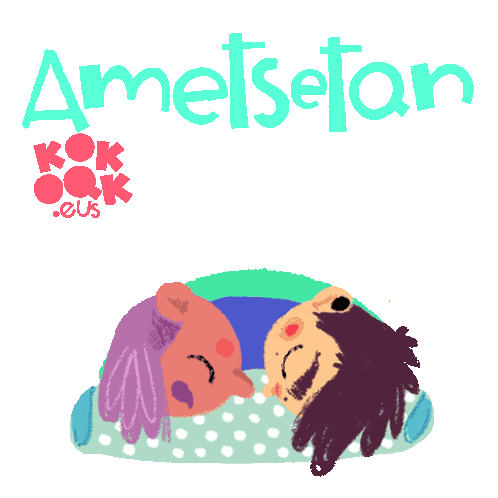 Two adorable characters sleep peacefully under a vibrant rainbow, with the word 'Ametsetan' (dreaming) above them.