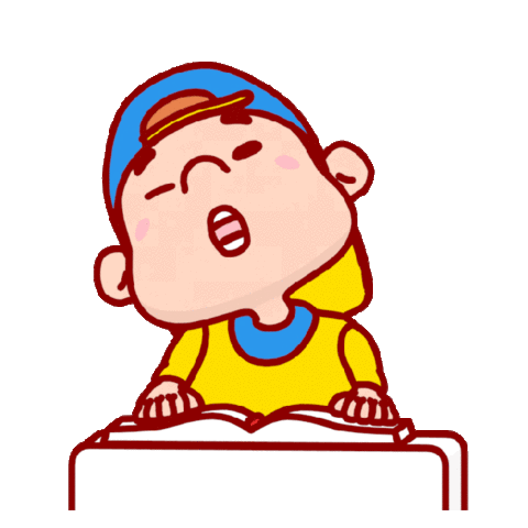 A cartoon boy in a blue cap dozes off while reading, then wakes up with a big, weary yawn.