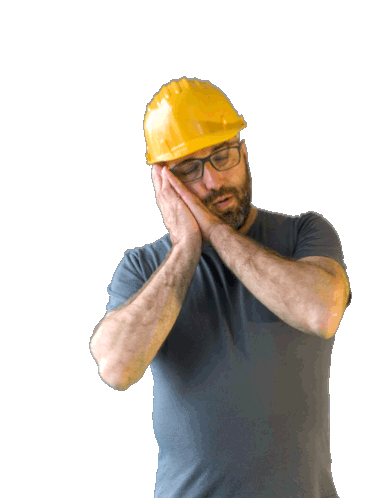 Josef Beneš, a construction worker in a yellow hard hat, makes a sleeping gesture, indicating rest or being tired.
